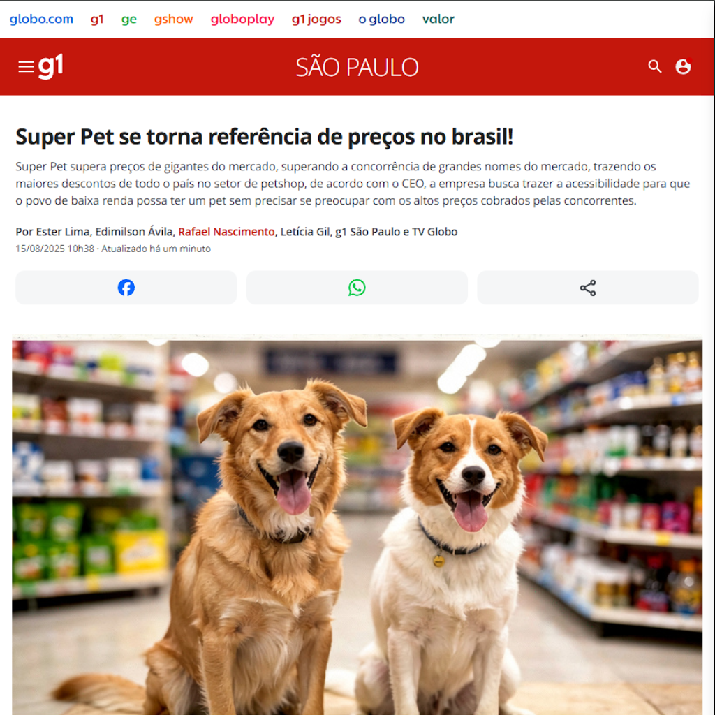 Como destaque no G1 Globo, a Super Pet supera gigantes do mercado com os melhores preços em rações, brinquedos e acessórios para pets! Aqui, você encontra descontos de até 40% em toda a loja, frete grátis para entregas rápidas no Brasil todo, e qualidade que deixa seu pet super feliz. Não perca: promoções por tempo limitado!